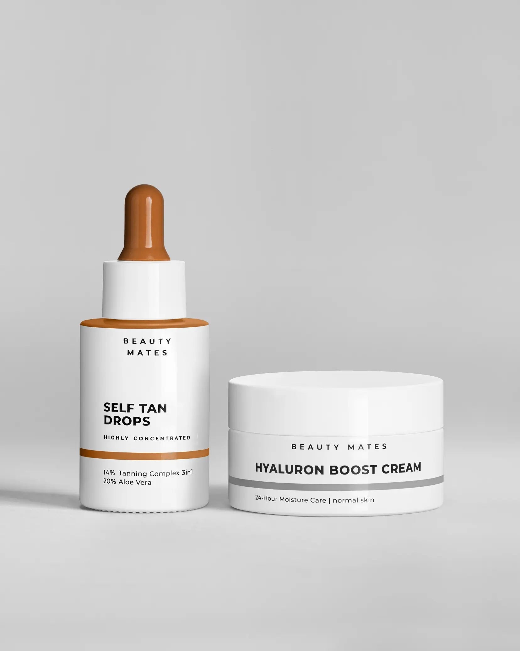 - The Self Tan Set, consisting of the Self Tan Drops and the Hyaluron Boost Cream, ensures an even and long-lasting tan that can be individually adjusted to your skin tone.